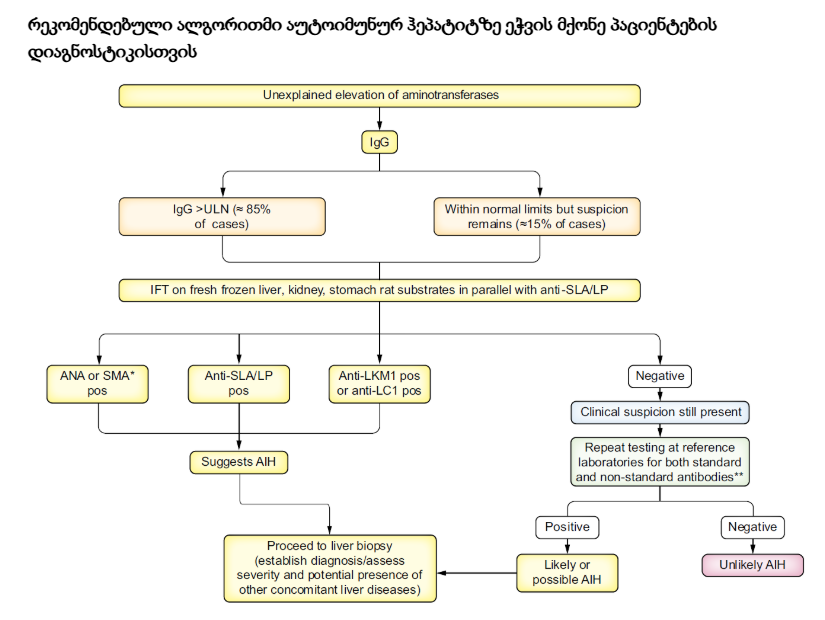 * * pANNA, anti-dsDNA, anti-SLA/LP, anti-LKM1, anti-LKM3, anti-LC1, anti-F-actin, anti-Ro52, anti-α-actinin ანტისხეულები შეიძლება შეფასდეს როგორც ზოგადი, ასევე სპეციფიკური ტესტებით. იმ შემთხვევაში, როდესაც აღნიშნული სეროლოგიური ტესტები ნეგატიურია, მაგრამ კლინიკური ეჭვი აუტოიმუნურ ჰეპატიტზე კვლავ რჩება, მიზანშეწონილია ღვიძლის ბიოფსიის ჩატარება აუტოაინტისხეულებ-ნეგატიური აუტოიმუნური ჰეპატიტის გამოსარიცხად ან დასადასტურებლად.