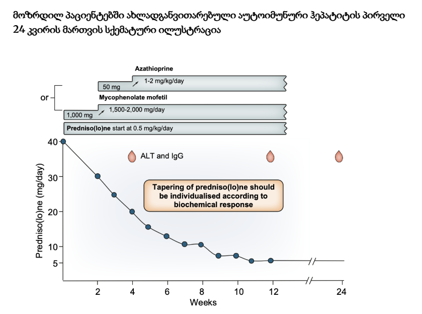თერაპიულ დონემდე მიკოფენოლატ მოფეტილის დოზა იზრდება (1,500–2,000 მგ/დღეში) მკურნალობის მე-2 კვირაზე, ხოლო აზათიოპრინის დოზა იზრდება მე-4 კვირიდან (1–2 მგ/კგ/დღეში). თერაპიული ეფექტის მონიტორინგისთვის აუცილებელია ALT-ის (ალანინამინოტრანსფერაზა) და IgG-ის (იმუნოგლობულინი G) განსაზღვრა მკურნალობის მე-4, მე-12 და მე-24 კვირებზე. უსაფრთხოების ბიომარკერების შერჩევა და მონიტორინგის სიხშირე კი ინდივიდუალურად უნდა იყოს მორგებული პაციენტის კლინიკურ მდგომარეობაზე.