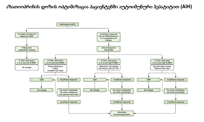 AIH – აუტოიმუნური ჰეპატიტი, 6-MMP – 6-მეთილმერკაპტოპურინი, 6-TGN – 6-თიოგუანინის ნუკლეოტიდები, TPMT – თიოპურინ მეთილტრანსფერაზა